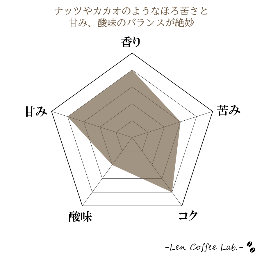 アーモンドのようなナッティな甘みとビターチョコレートのようなカカオ感が特徴。苦・甘・酸味のバランスがベストでシンプルに美味しい。いつ飲んでも飽きない味です。